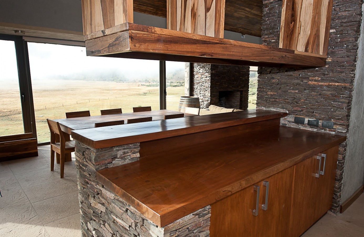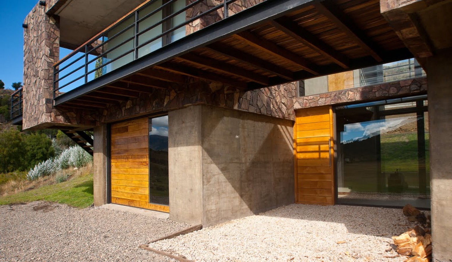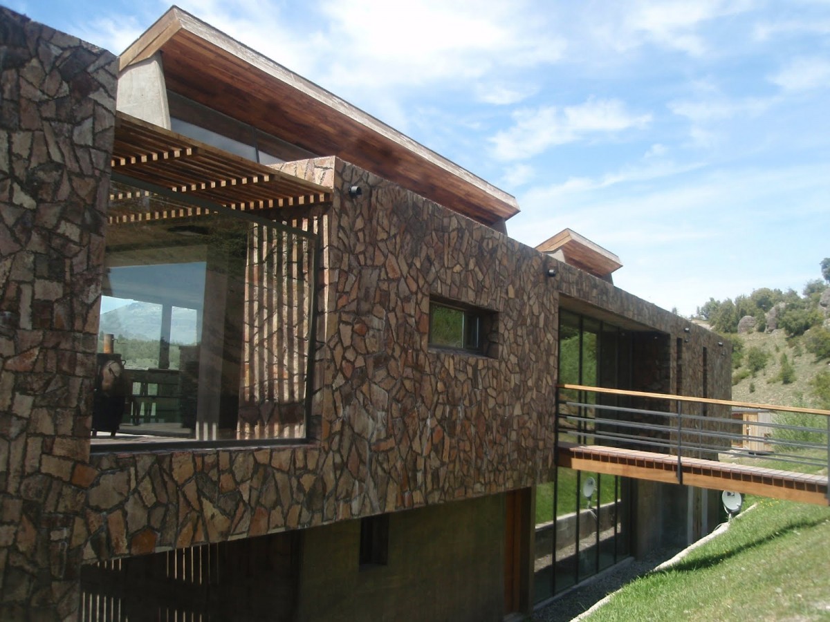 La piedra, el hormigón visto ,materiales de muy bajo mantenimiento, también se usaron en el interior para destacar algunos elementos, como la chimenea revestida en la misma piedra exterior pero en forma de pirca, el techo inclinado de los lucernarios es una superficie continua de hormigón visto al igual por ejemplo, que la barra que separa el comedor de la cocina.