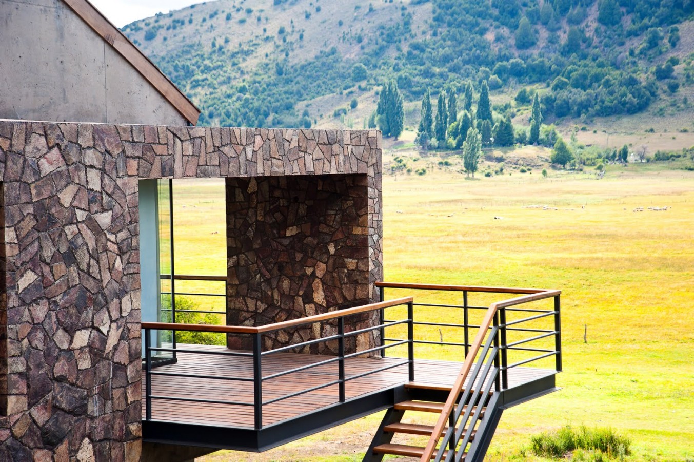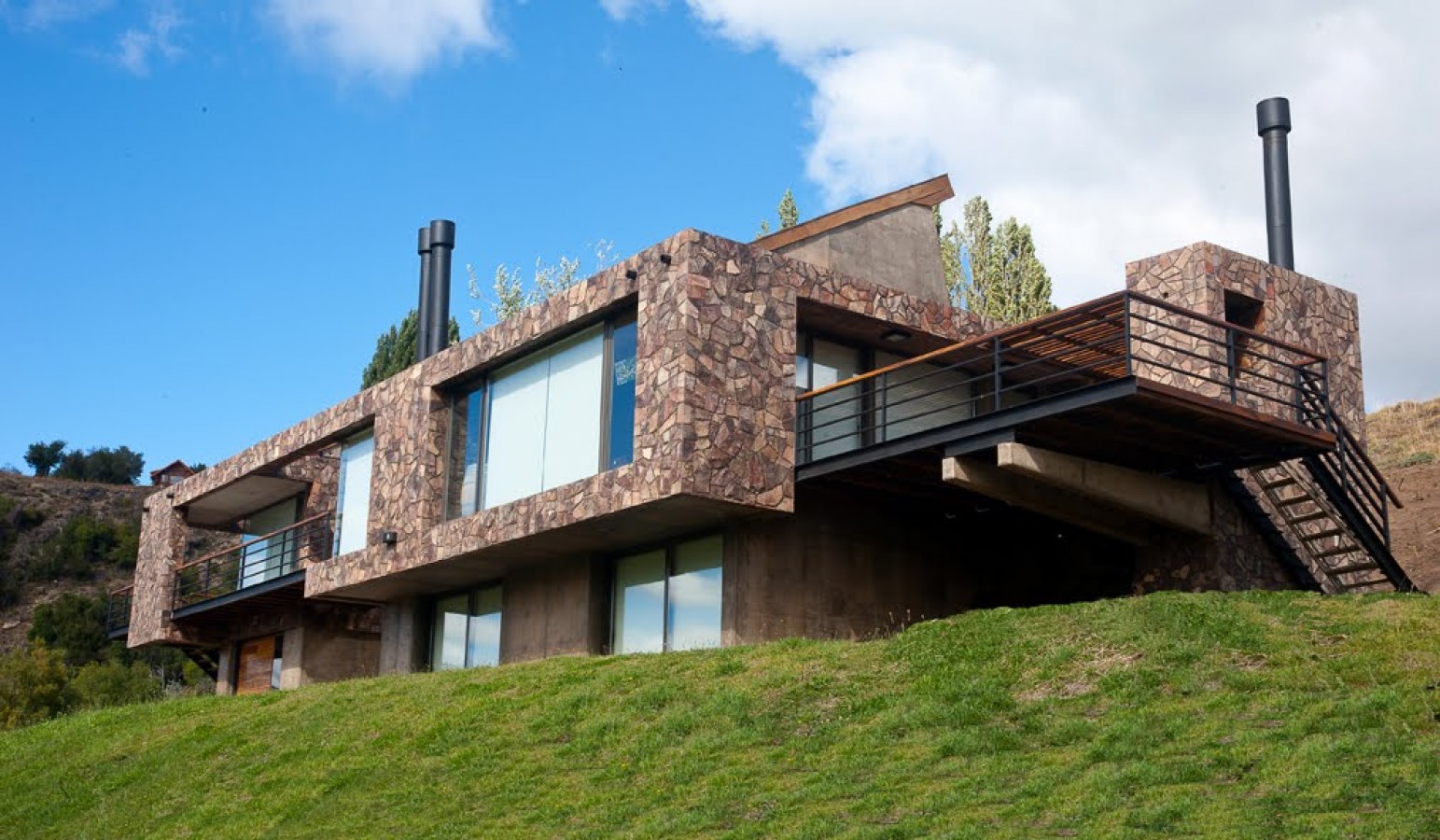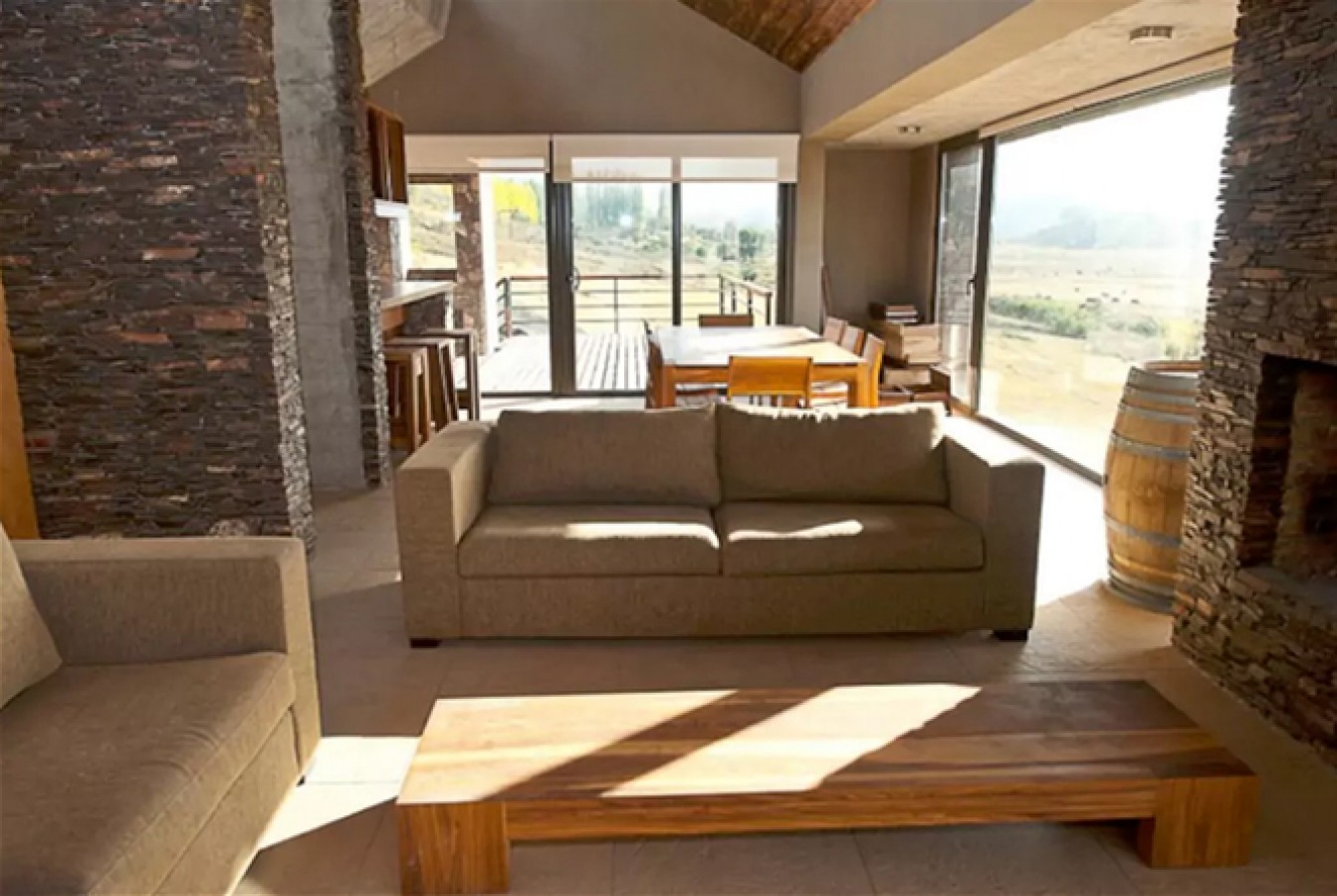 La piedra, el hormigón visto ,materiales de muy bajo mantenimiento, también se usaron en el interior para destacar algunos elementos, como la chimenea revestida en la misma piedra exterior pero en forma de pirca, el techo inclinado de los lucernarios es una superficie continua de hormigón visto al igual por ejemplo, que la barra que separa el comedor de la cocina.
