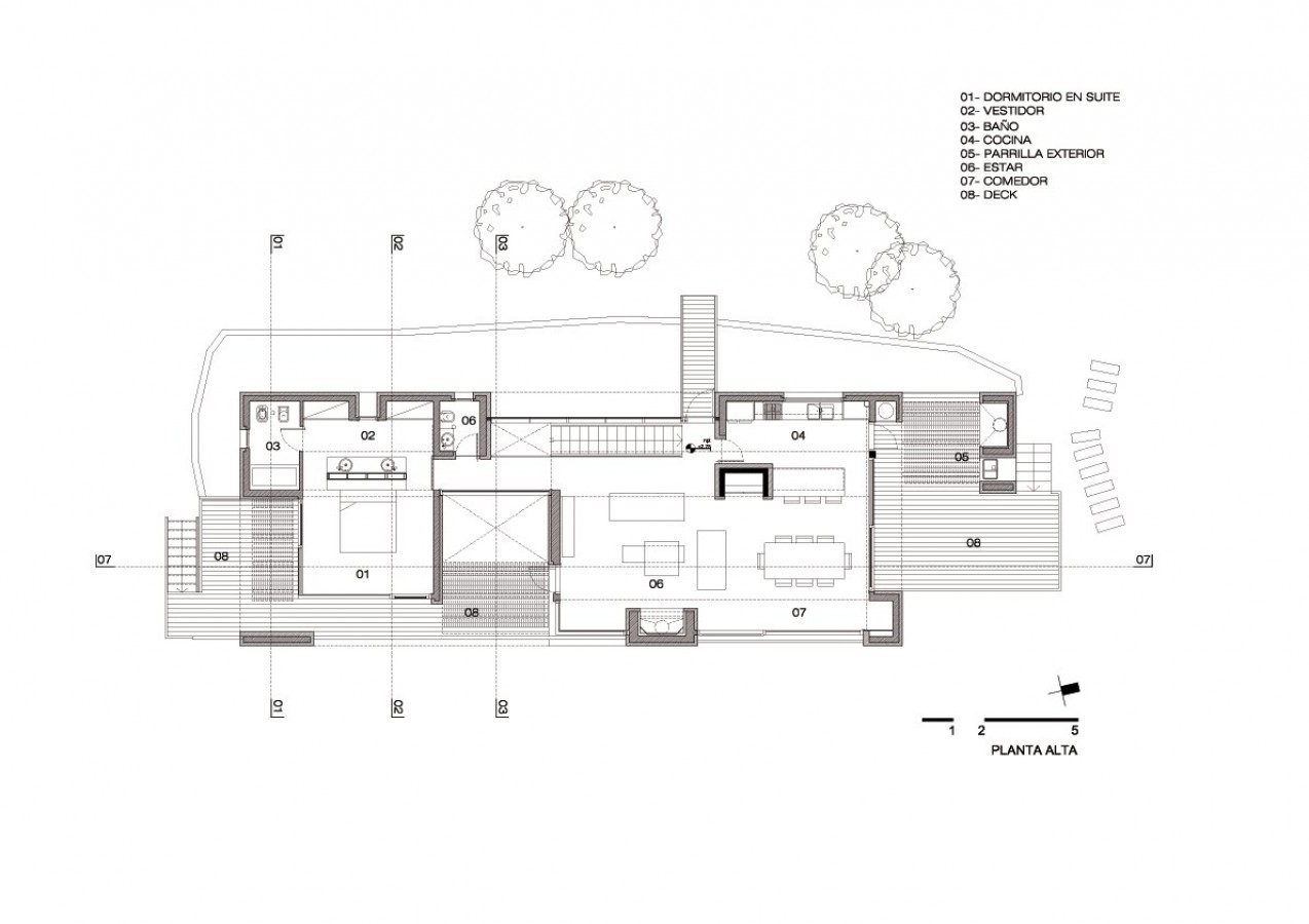 Al trabajar estos dos volúmenes superpuestos logramos el objetivo de que la casa tuviera una lectura horizontal sobre el terreno, generando así una mejor relación con la pendiente del lote. De esta manera, con los decks laterales que vuelan para encontrarse con el terreno sin llegar a tocarse, también logramos vincular la planta alta de carácter social con el parque a través de unos pocos peldaños.