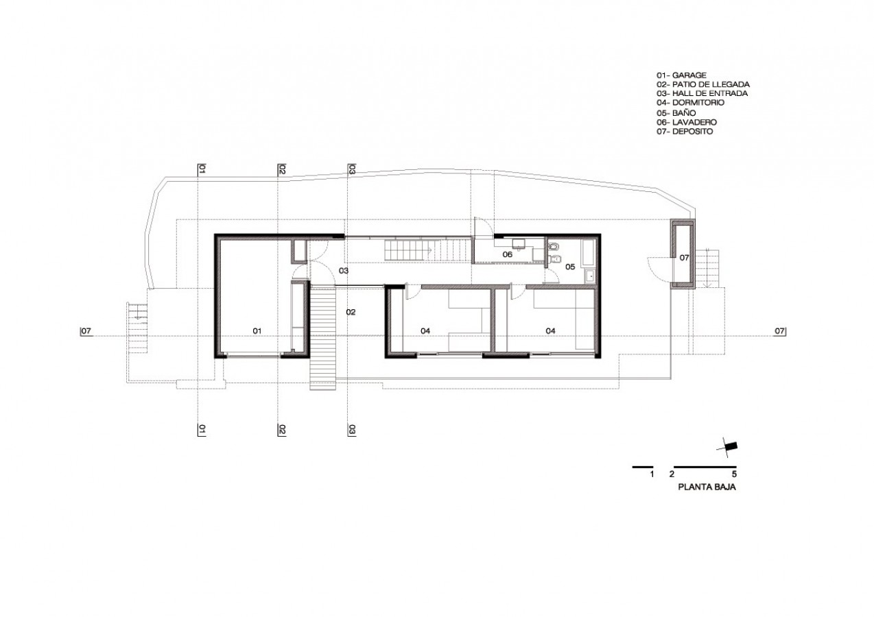 La búsqueda formal y expresiva se centró en un fuerte manejo de los volúmenes, los vacíos y el material. La planta alta se destaca como un volumen claro y contundente que flota y se apoya sobre el volumen inferior, construido en hormigón armado visto. El volumen superior se revistió en piedra y posee un gran juego expresivo gracias al juego de vacios que se forma a través de los huecos que penetran en el incorporando el exterior, ya sea en los aventanamientos en los semicubiertos o los decks perimetrales que recorren la casa y el patio de acceso. La piel de piedra que reviste este volumen juega un papel preponderante en la elaboración de esta pieza ya que se colocó de manera continua incluso en las esquinas donde la misma no pierde continuidad en sus aristas.