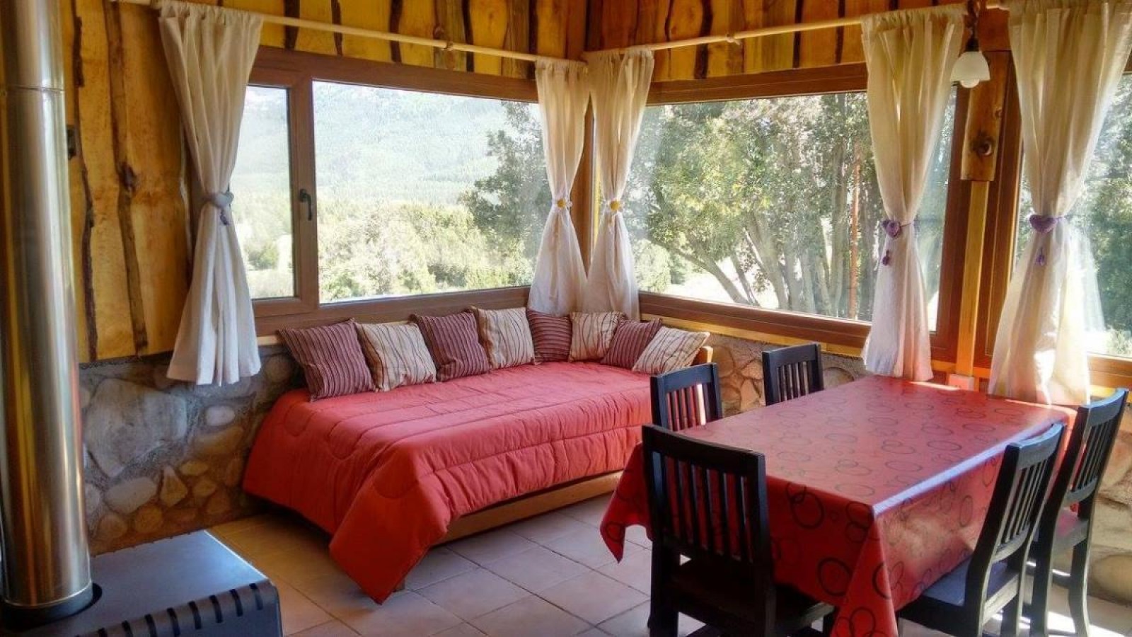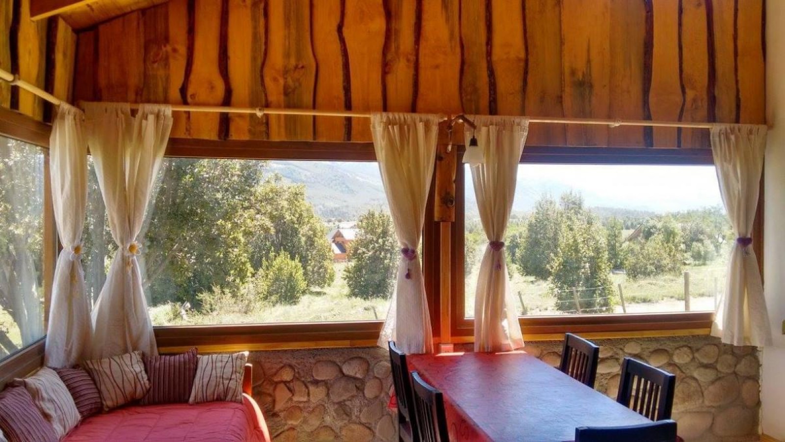 Cada cabaña tiene 50 mts2 cubiertos, baño y cocina completa. Una equipada para 4 personas y la otra para 3 personas. TV, cocina, salamandra, heladera, camas, sabanas, toallas y toallones, vajillas, etc.